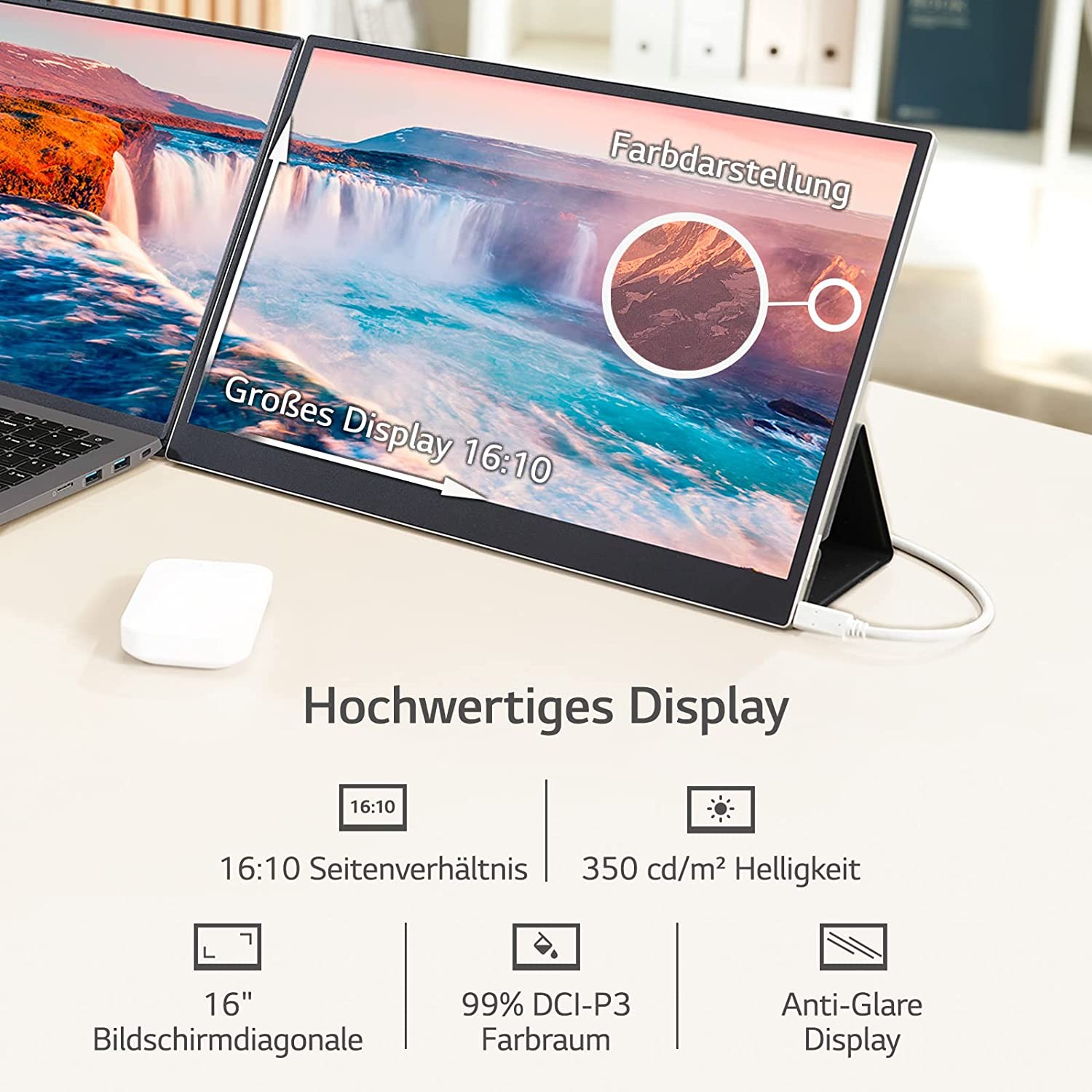 • High quality additional display in 16:10 format, native WQXGA resolution (2560 x 1600). Two USB Type-C ports (with DisplayPort alternative mode).