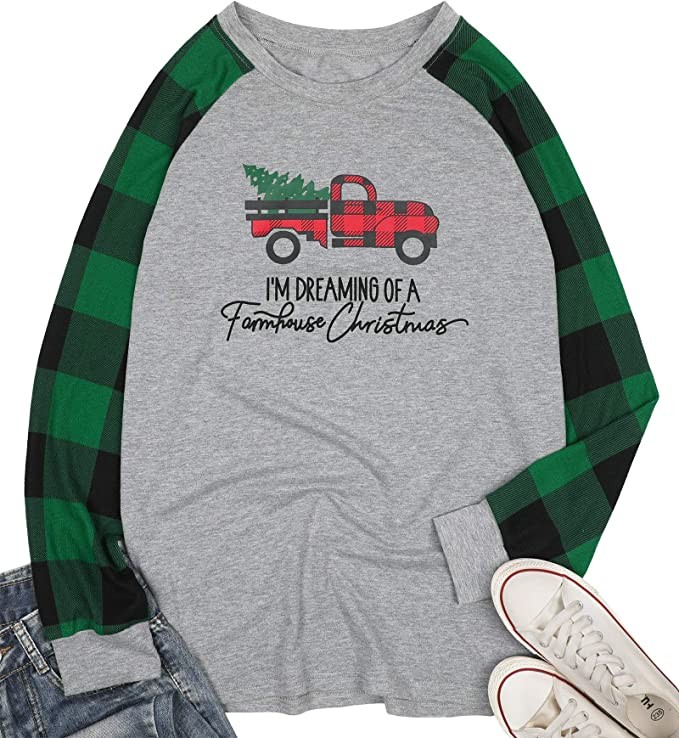 Merry Christmas Shirt Women's Christmas Long Sleeve Raglan Shirt Christmas Plaid Truck Tree Pattern Shirt, -1, Medium