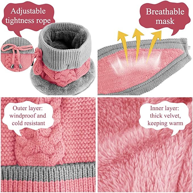 3 IN 1 ACCESSORIES - 1 set of 3 includes a knitted winter hat with fleece lining, adjustable scarf and a detachable face shield, this combo will keep your head, ears and neck warm.